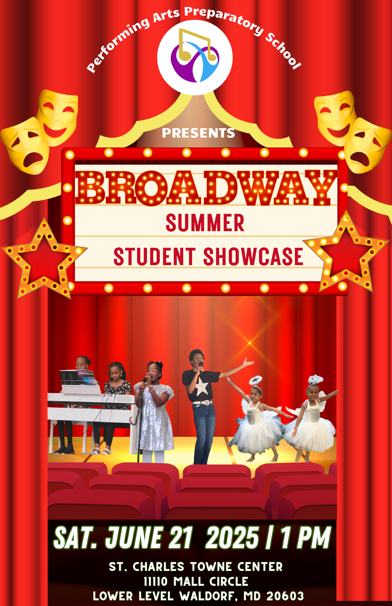 Join us on Saturday, June 21st, in the St. Charles Towne Center at 1:00 pm for an unforgettable afternoon filled with powerful Vocalists, Dancers, and Musicians. Back On Broadway will showcase golden age classics to modern hits performed by our very own students.